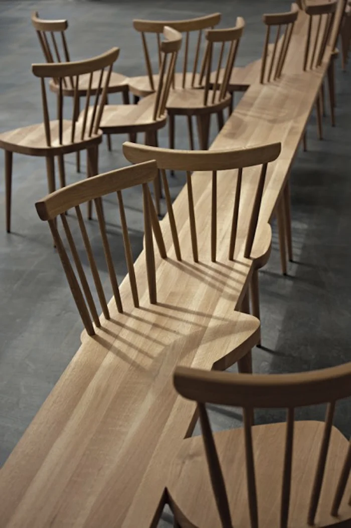 Stuhlhockerbank, by German design studio Kraud, is a series of seating for public spaces. The unusual form of the bench makes people think in an other way about how to sit in a public space. The object seems familiar and yet at the same time surprising, enhanced by a sensual and poetic dimension. It’s giving you the possibility to make an other connection with the public space but also with the people around you. Are you going to sit in front of someone, or are you turning your back at the other person?