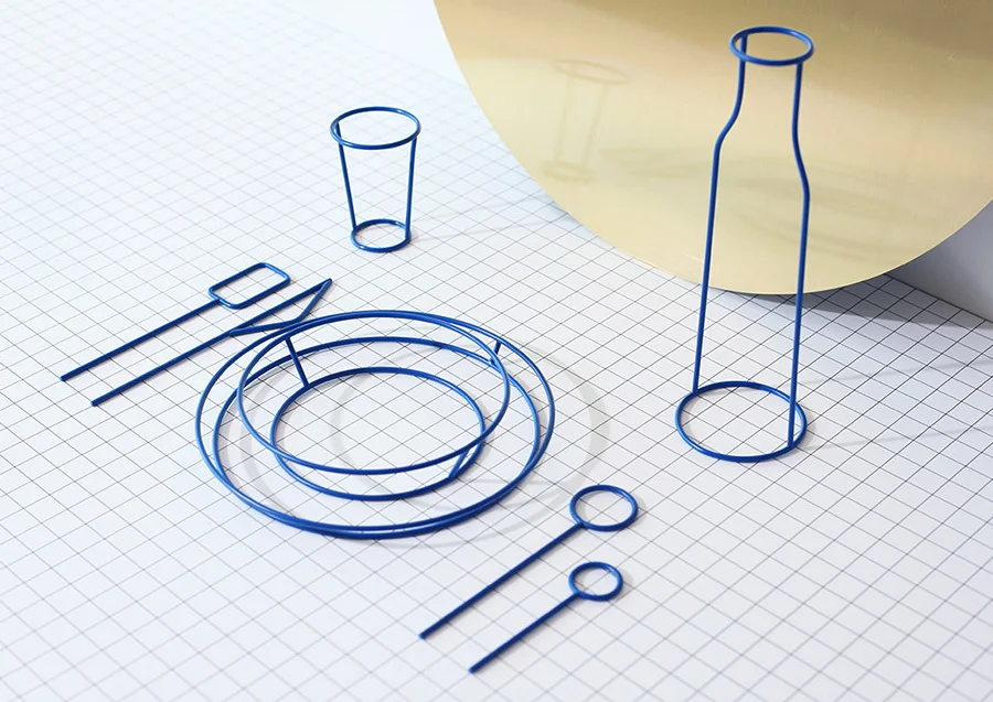 Fasted focuses on the representation of tableware by producing a drawing in volume made of blue metal wire.